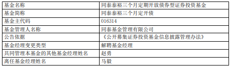 中国经济网北京4月21日讯 今日,同泰基金公告,马毅离任同泰泰裕三个月定开债