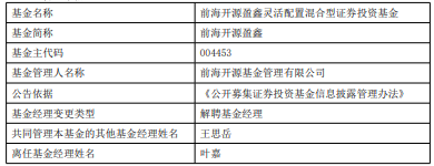 中国经济网北京4月22日讯 今日,前海开源基金公告,叶嘉离任前海开源盈鑫,王思岳管理。