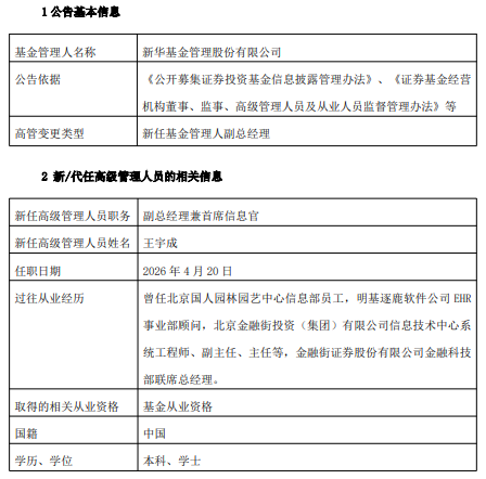 中国经济网北京4月22日讯 今日,新华基金公告,任命王宇成为副总经理兼首席信息官。