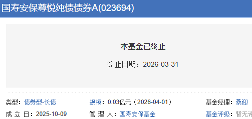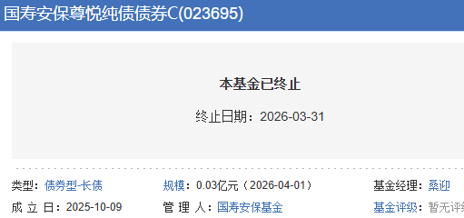 报告称,国寿安保尊悦纯债债券型证券投资基金基金合同于2025年10月9日正式生效。根据《中华人民共和国证券投资基金法》《公开募集证券投资基金运作管理办法》以及基金合同的有关规定,基金合同生效后,若出现下列情形之一,经履行相关程序后,《基金合同》应当终止:(1)基金份额持有人大会决定终止的;(2)基金管理人、基金托管人职责终止,在6个月内没有新基金管理人、新基金托管人承接的;(3)《基金合同》约定的其他情形;(4)相关法律法规和中国证监会规定的其他情况。根据《基金合同》第五部分“基金备案”第三条约定:“《基金合同》生效后,连续20个工作日出现基金份额持有人数量不满200人或者基金资产净值低于5000万元情形的,基金管理人应当在定期报告中予以披露;连续50个工作日出现前述情形的,基金管理人应当按照基金合同的约定程序进行清算并终止基金合同,无需召开基金份额持有人大会进行表决。”截至2026年3月30日终,该基金基金资产净值已连续50个工作日低于5000万元,已触发《基金合同》中约定的基金合同终止事由。根据《基金合同》的有关约定,该基金将进入基金财产清算程序,且无需召开基金份额持有人大会。