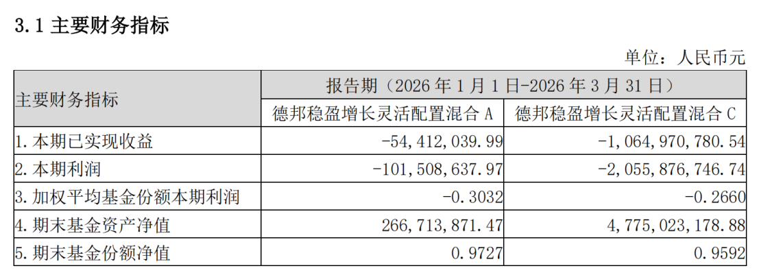 最新披露的2026年一季报显示,在今年一季度,德邦稳盈增长灵活配置已实现的收益为-11.19亿元;再加上公允价值变动收益,这只基金一季度更是亏损了21.57亿元。