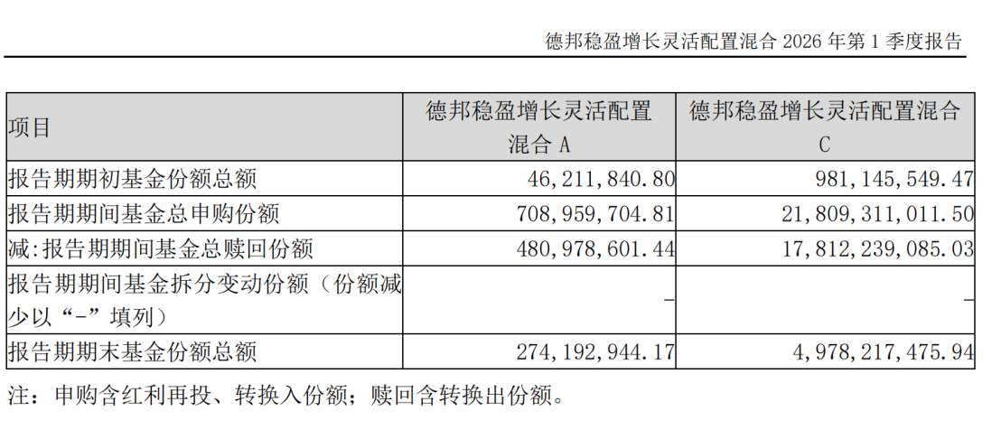 一只亏损纪录刷新、净值回撤的产品,能在一季度规模增长近4倍,足见份额申赎的“威力”。数据显示,德邦稳盈增长灵活配置的基金份额总额增加42.25亿份,已经是该基金成立以来增量最多的一个季度。