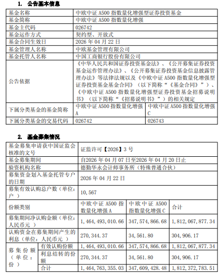 中国经济网北京4月23日讯 今日,中欧基金发布中欧中证A500指数量化增强型证券投资基金基金合同生效公告。