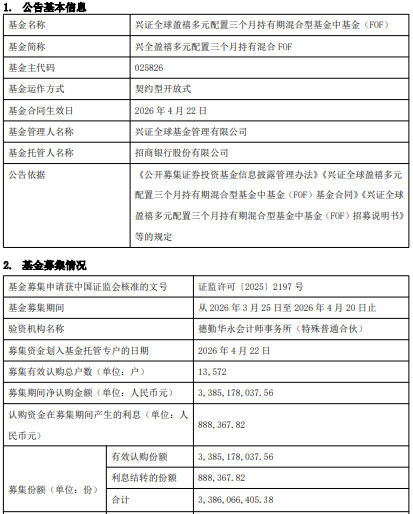 募集期间净认购金额3,385,178,037.56元,认购资金在募集期间产生的利息888,367.82元,募集份额合计3,386,066,405.38份。