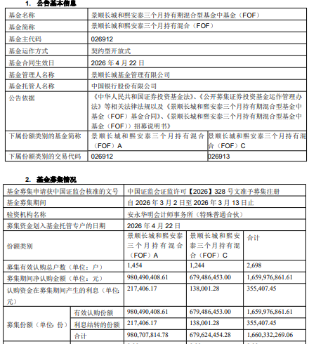 中国经济网北京4月23日讯 今日,景顺长城基金发布关于景顺长城和熙安泰三个月持有期混合型基金中基金(FOF)基金合同生效的公告。