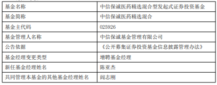 中国经济网北京4月23日讯 今日,中信保诚基金公告,中信保诚医药精选混合增聘陈亚杰。