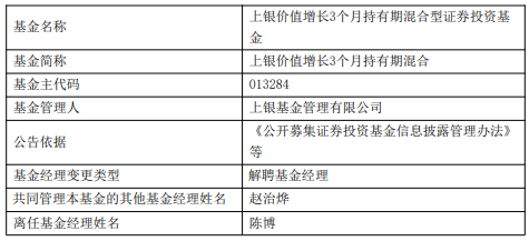 中国经济网北京4月23日讯 昨日,上银基金公告,陈博离任上银价值增长3个月持有期混合,赵治烨管理。