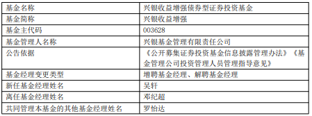 中国经济网北京4月23日讯 昨日,兴银基金公告,兴银收益增强增聘吴轩,邓纪超离任。