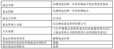 中国经济网北京4月24日讯 今日,信达澳亚基金公告,朱然离任信澳智选先锋一年持有期混合。