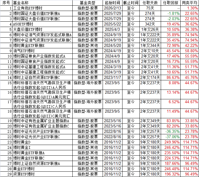 目前,王祥还管理着29只指数型基金,从任职回报看,其中有4只基金出现亏损,分别是博时国证大盘价值ETF联接A/C任职回报为-1.81%、-2.03%,博时中证光伏产业ETF联接A/C任职回报为-36.35%、-37.06%。
