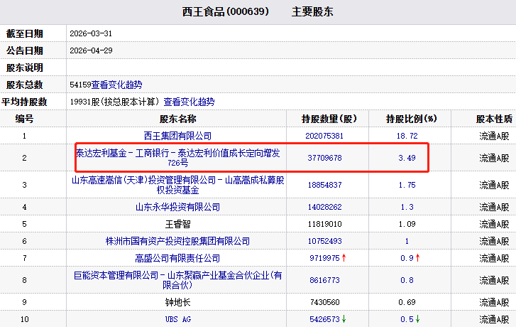 西王食品2026年1季报显示,泰达宏利基金(现改名为宏利基金)旗下的泰达宏利价值成长定向增发726号持有该公司3770.97万股,持股比例为3.49%,为第二大股东。