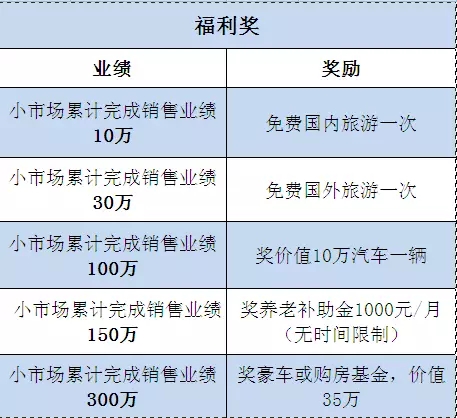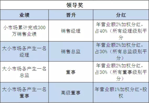 层碰奖(市场开发奖)一层回本100%,二到无限层1:1*50%。除了层级奖,大小市场还分别有奖励。大市场有见点奖励,代理商可享有每日新增单笔业绩提成30元,最多可获20层(理论上获200万单的业绩奖励);而小市场有培育奖,最高可达7%。