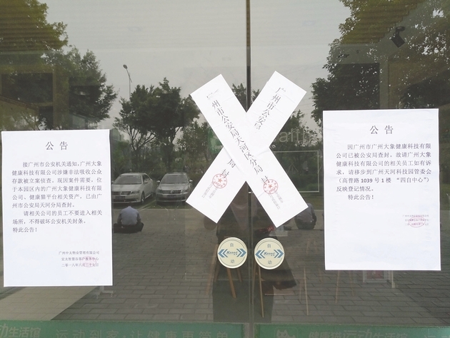 《每日经济新闻》记者当日下午实地探访了大象健康办公所在地——广州市天河区宏太智慧谷3号楼,大象健康办公楼入口已贴上查封公告,保卫人员称,警方正在楼上进行搜查,外人无法进入。