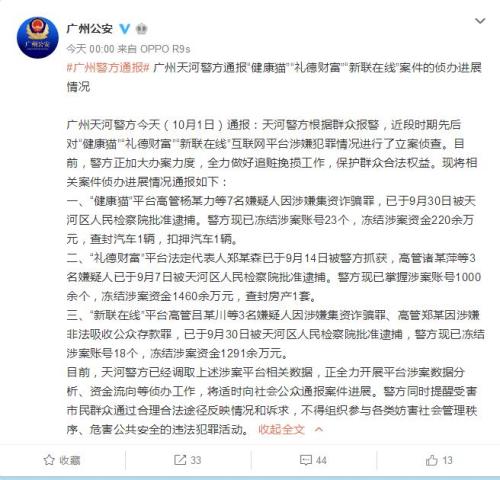 中新网10月1日电 据广州市公安局官方微博消息,广州天河警方10月1日通报“健康猫”“礼德财富”“新联在线”案件的侦办进展情况,通报称,天河警方根据群众报警,近段时期先后对“健康猫”“礼德财富”“新联在线”互联网平台涉嫌犯罪情况进行了立案侦查。目前,警方正加大办案力度,全力做好追赃挽损工作,保护群众合法权益。