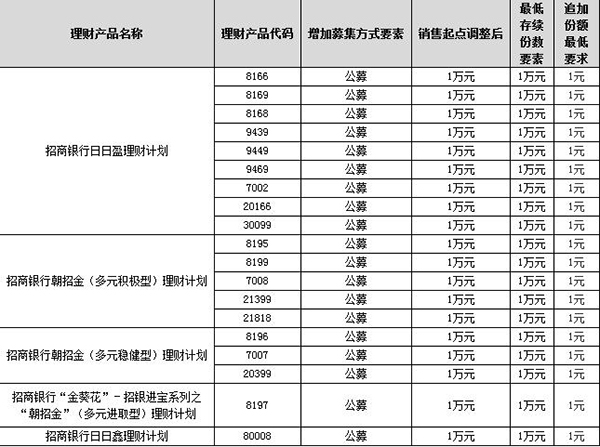 招商银行:9日起19款理财产品销售起点调整至1万元