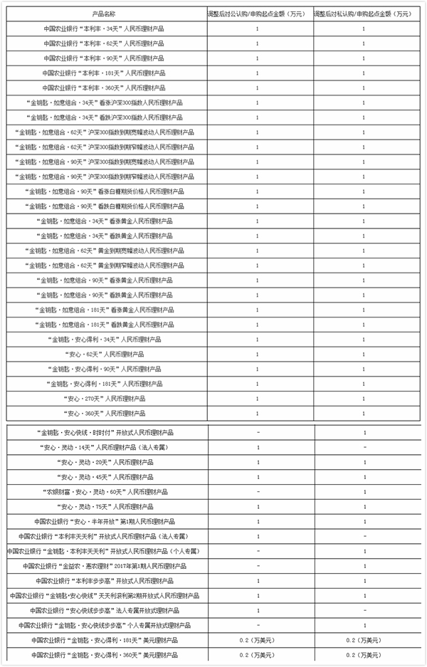 9月30日,农业银行发布《关于调整部分理财产品销售起点金额的公告》,调整40余款理财产品起购金额。