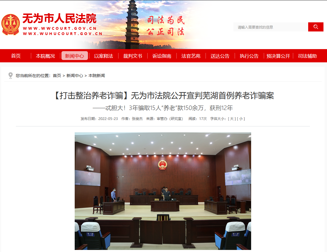 无为市人民法院法官表示,目前,全国正在开展打击整治养老诈骗专项行动,专项行动已进入打击整治的关键环节。无为市法院闻令而行,积极贯彻全国法院打击整治养老诈骗专项行动推进会精神,认真履行审判职责,坚决打击一切形式的养老诈骗犯罪,最大限度做好“追赃挽损”工作,守护人民群众特别是老龄群体养老“钱袋子”,为广大老年朋友安度晚年筑起坚实的司法保护屏障。