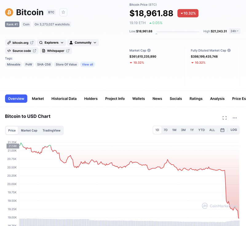 比特币价格跳水,日内连失2万及1.9万美元关口,跌破18个月以来最低价