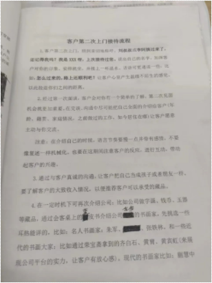 在公司里民警发现了话术本,对第一次、第二次接待流程规定得很细,比如第一次接待询问客户就要称呼“阿姨”“叔叔”,在沟通中要了解客户的年龄、住址、家庭情况,介绍公司时要求销售人员节奏要慢一点,关注客户表情和反应,要讲礼貌、耐心,无论成单与否,都要送上一份礼品,把公司的优惠活动、会员日、积分换礼品讲给客户。