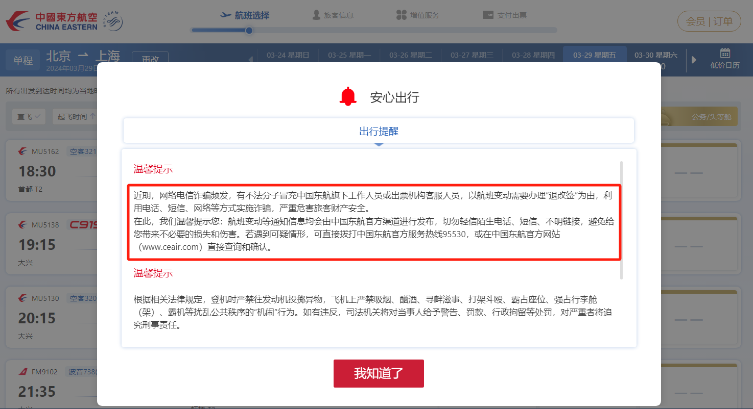 据了解,航司和OTA也在持续进行预防诈骗工作。例如,中国东方航空官网就在预订机票页面对退改签诈骗进行弹窗提示。记者近期通过携程旅行App预订机票后,在收到的短信中也包含预防诈骗的提示信息。