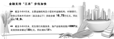 央行最新公布的金融数据显示,“三农”贷款增速全面回升。截至今年9月末,主要金融机构及小型农村金融机构、村镇银行、财务公司本外币农村(县及县以下)贷款余额 16.73万亿元,同比增长18.6%。