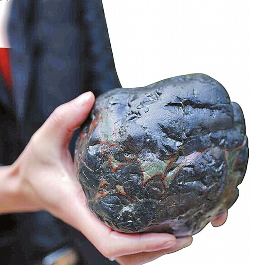 昨日15时许,徐先生在家中很郑重地将奇石捧在手上供记者欣赏。这块石头通体是黑色的,中间还有一些橄榄色的花纹。体积不是很大,但捧在手中挺沉,大概有1600克左右。徐先生介绍,去年4月份,他和朋友自驾去香格里拉游玩,来到一个叫乡城的地方,他在一条小河边玩耍时,发现了这块石头。当时在阳光下觉得它很漂亮,便捡了回来。