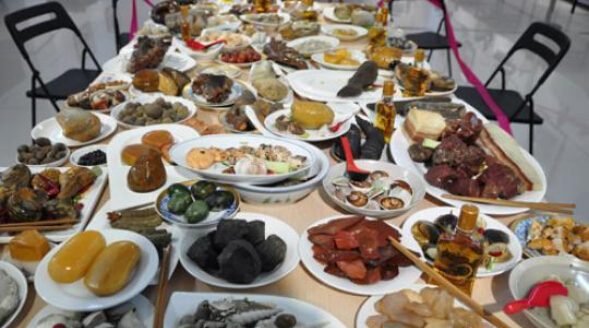 展厅内的一桌“奇石宴”更令人叹为观止。石头“红烧肉”红白相间,色泽亮丽;玛瑙“窝窝头”形态逼真;洁白的蛋白石装在碗中,配以清水、香菜、辣椒,极像一碗豆腐脑。此外,还有如同“碳烤牛肉”的罗布泊陨石和哈密陨石,以及亿年前的海生物化石“海螺”、“螃蟹”等,80余道精美“奇石菜肴”被摆在“餐桌”上,令人垂涎欲滴。