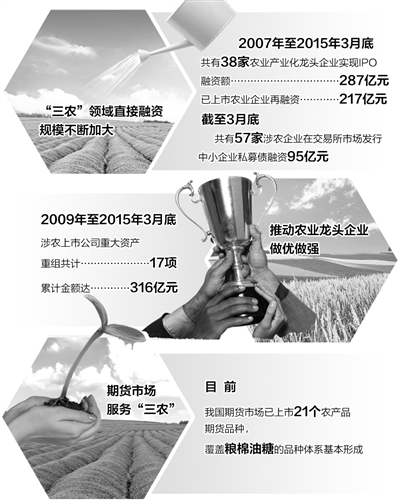 近年来,“三农”领域的直接融资规模已不断加大。数据显示,2007年至2015年3月底,共有38家农业产业化龙头企业实现首次公开发行股票并上市,融资额达287亿元;已上市农业企业再融资217亿元。截至今年3月底,共有57家涉农企业在交易所市场发行中小企业私募债融资95亿元。