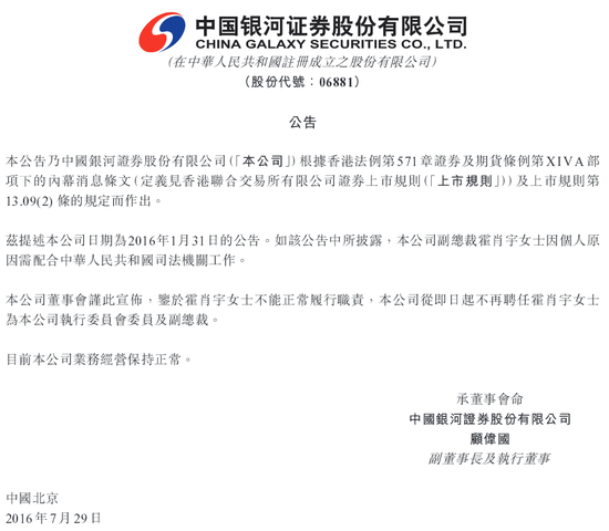 新浪财经讯 7月29日下午,银河证券在港交所发布公告称,因霍肖宇不能正常履职,公司即日起不再聘任其为公司执行委员会委员及副总裁。霍肖宇为此前被查的国家统计局原党组书记、局长王保安的妻子,在业内被认为精通业务,作风干练。