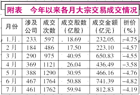 数据统计显示,截至7月28日,在月内还有一个交易日未被记入统计范围的情况下,沪深两市共有461家A股公司发生大宗交易1762次,累计成交59.94亿股,涉及成交金额812.83亿元,成交总股数和成交总规模均刷新了年内交易新高。