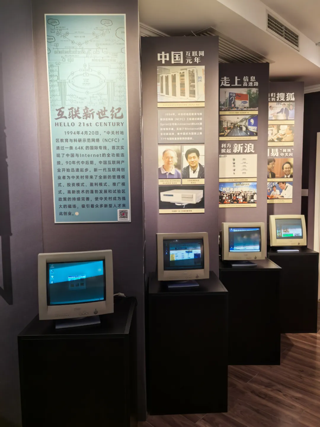 展厅里醒目位置摆着一排老式电脑,还有伴随很多人开启“触电”“触网”生活的3.5寸磁盘、瑞星杀毒软件、瀛海威上网卡……但中关村的“科创基因”又岂止于此——