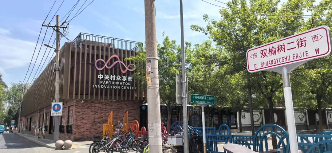 中关村村史馆外墙上醒目的“中关村众享荟”标志。本报记者李牧鸣摄