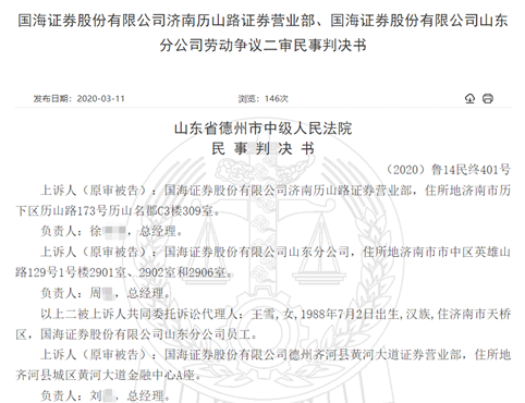 对于这一判决结果,国海证券济南历山路证券营业部、德州齐河县黄河大道证券营业部、山东分公司对上述判决结果不满,提起上诉。历山路营业部、山东分公司认为,王某某是与齐河路签订的劳动合同,因此要求支付12月工资的事宜与自己无关。