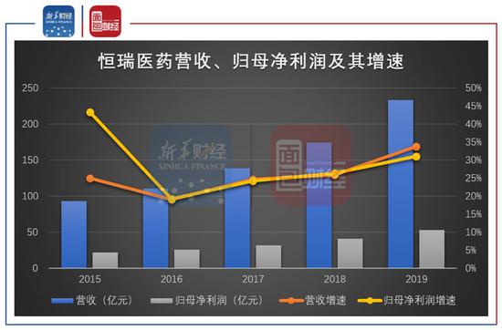 图2:2015-2019年恒瑞医药营收、归母净利润及其增速