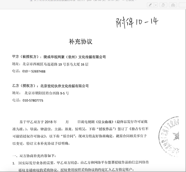 按照娄晓曦的说法,就算是2018年行业低谷期,世纪伙伴还是卖出了两部大剧,与上市公司华视网聚签了《倩女幽魂》的“独占专有不可撤销授权许可协议”,另一部大剧《大宋宫词》也被平台独家买断。“我已经卖完了这个剧,合同也弄好了。”娄晓曦说,在2019年春节前,他还问了一位张姓高管合同是否还有问题,对方表示“没问题”。