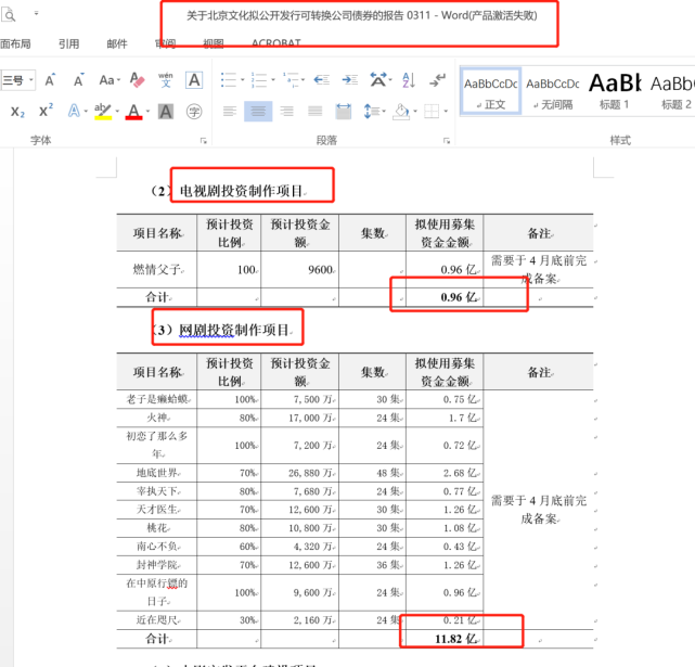 在娄晓曦的强烈反对下,北京文化变更了可转债报告,募集资金不超过20亿元;募集资金拟投入额的分配上,电影占了11.1亿元,网剧占了5.92亿元,娄晓曦负责的电视剧占2.98亿元。
