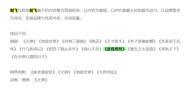 公开报道显示,2018年8月耐飞的发布会上,北京文化副总裁、《封神三部曲》总制片人杜扬宣布,30亿量级的华语史诗电影《封神三部曲》的同名网剧,将交予耐飞独家开发。每经记者查询发现,上述北京文化可转债方案中的网剧投资制作项目,都可以在耐飞招聘启事的项目介绍中对应到。