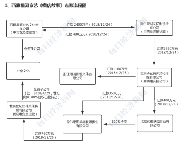比如《横店故事》的走账,首先北京文化在回复中承认,西藏星河(北京文化全资孙公司)跟霍尔果斯文忆签订了对《横店故事》进行联合投资的合同,而且也承认了西藏星河向霍尔果斯文忆打款2400万,并先获得480万的投资收益。