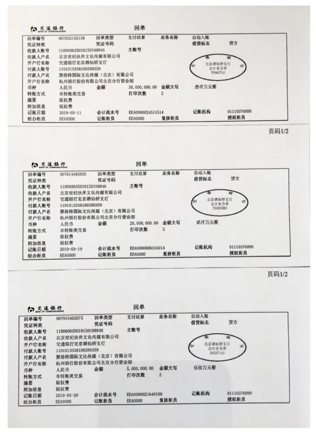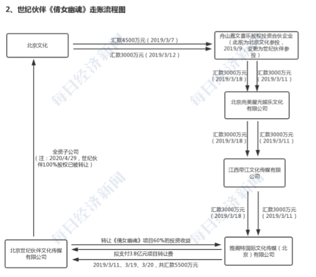 娄晓曦提供的《倩女幽魂》资金往来中,雅阁特、世纪伙伴等之间部分转账记录