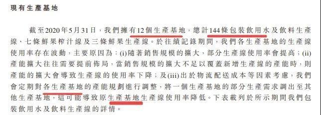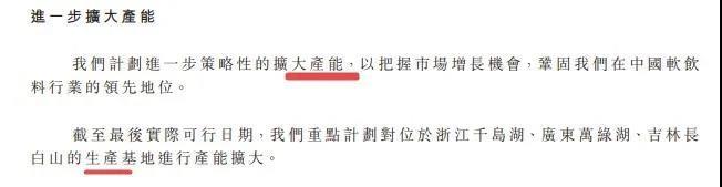 申请文件开头“概要”部分,农夫山泉称“对优质天然原水做包括过滤及杀菌在内的必要处理”,这里没有“生产”二字。但在申请文件中,多处使用“生产”二字,包括“生产基地”、“生产线”、“新建工厂”、“产能”等。