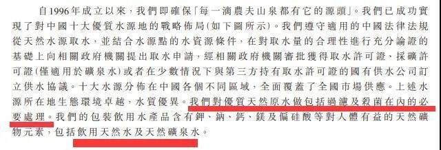 招股申请文件显示,1997年,农夫山泉推出“农夫山泉有点甜”广告语,使广大消费者熟悉农夫山泉品牌。后发起饮用水标准之争,使其在饮用水获得市场地位。2008年,农夫山泉推出广告语“我们不生产水,我们是大自然的搬运工”,强调“天然”产品理念。