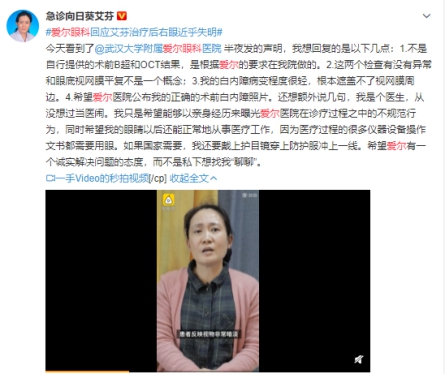 与此同时,针对爱尔眼科声明中提到的“周边部分被白内障遮挡”的检查结果,艾芬表示,自己的白内障病变程度很轻,根本遮盖不了视网膜周边,希望爱尔医院公布其正确的术前白内障照片,“有一个诚实解决问题的态度,而不是私下想找我‘聊聊’”。