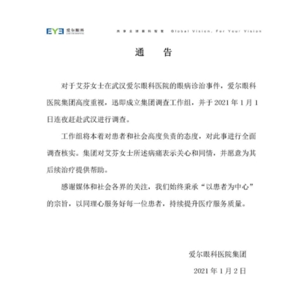 1月2日凌晨,爱尔眼科微信公众号发布通告称,对于艾芬女士在武汉爱尔眼科医院的眼病诊治事件,爱尔眼科医院集团高度重视,迅即成立集团调查工作组,已于2021年1月1日连夜赶赴武汉进行调查。