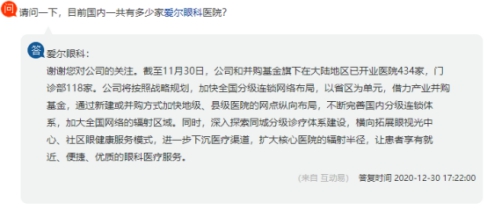 数据显示,2014年至2017年,爱尔眼科累计通过基金并购医院数量超120家,平均每年新增40家。而据爱尔眼科董秘此前在互动平台上的回复显示,截至2020年11月30日,爱尔眼科和并购基金旗下在大陆地区已开业医院已经有434家,门诊部118家。