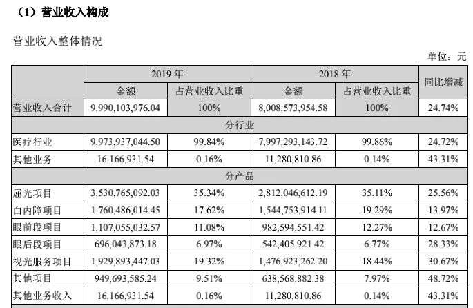 爱尔眼科的营收主要来自屈光手术和白内障手术,前者2019年贡献了35.34%的营收,毛利率达57.38%;后者贡献了17.62%的营收,毛利率为40.1%。