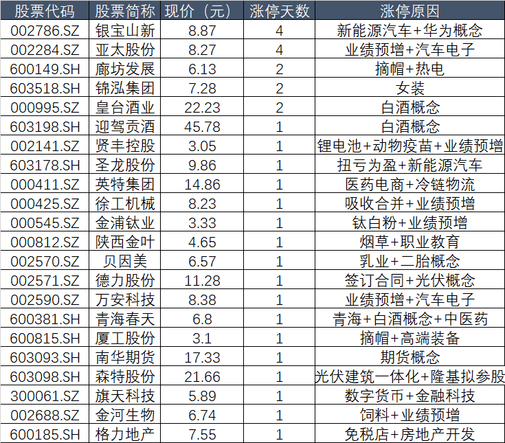 其他涨停股,分布在新能源车、白酒、数字货币等题材。