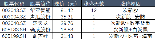 今天有5只次新股涨停,其中华亚智能(003043.SZ)上市后12连板,其他个股都是1板,由此可见,次新股并没有打出赚钱效应。