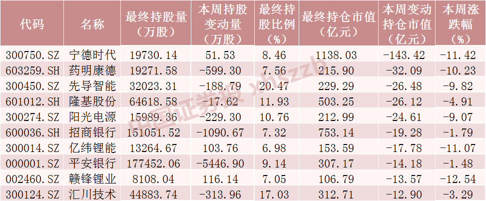 从市场表现看,本周北向资金持仓市值减少额前十的股票均下跌。其中,赣锋锂业跌幅最大,本周累计下跌12.54%;宁德时代次之,累计下跌11.42%。
