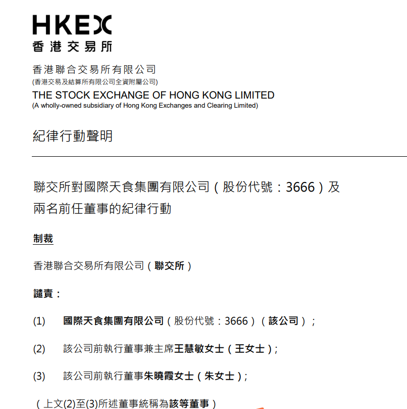 港交所对前称为小南国的国际天食(03666.HK) 两名前董事王慧敏及朱晓霞采取纪律行动,称两人向关联人士提供贷款及采购交易,并违反香港上市规则的相关规定。
