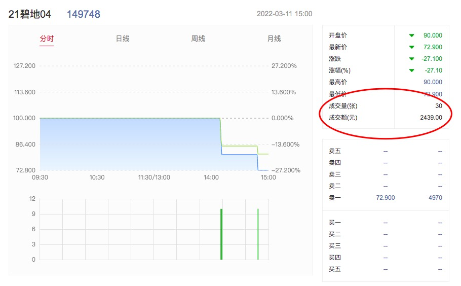 令人震惊的是,存续规模10亿元的“21碧地04”债券3月11日暴跌27.10%、触发临时停牌的背后,成交金额仅2439元,且成交均发生在14时以后。上一次出现2400多元“砸停”数亿规模债券的房企是阳光城。(详见:震惊!8亿规模债券被2460元砸停牌!房企债券频遭做空,两大手法揭秘)
